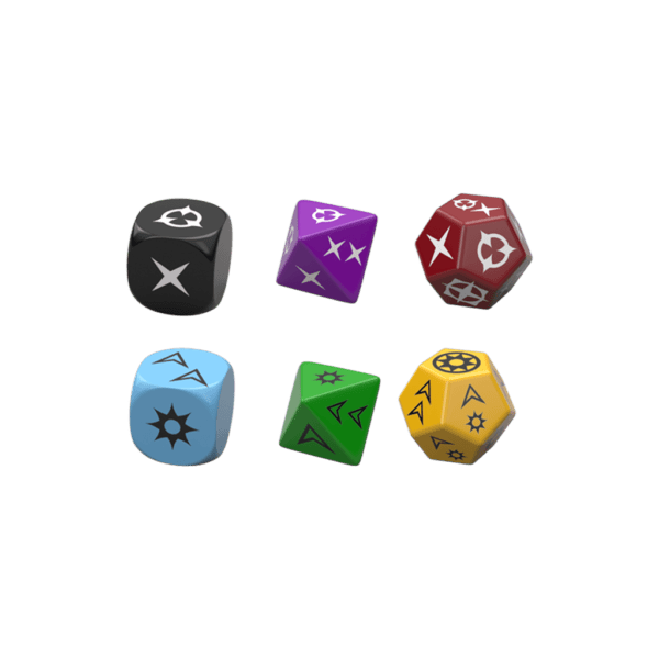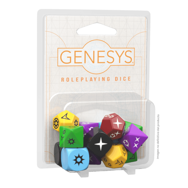 Genesys is a roleplaying game that utilizes the critically-acclaimed Narrative Dice System while a ruleset that can be used in a wide variety of settings. Take to the skies in a Victorian airship, slay an ancient dragon, or pilot your very own starship. All this and more is possible with the Genesys system, which uses the specialized dice found in this pack to propel adventures. The Genesys Roleplaying Dice Pack features three Ability dice, three Difficulty dice, two Setback dice, two Boost dice, two Proficiency dice and two Challenge dice, giving you everything you need to run your own game of Genesys.These specialized dice provide dynamic results to every skill check, allowing players to succeed in their task while experiencing a massive setback, or finding some advantage in a massive failure. Not only that, but the dice are easy to interpret, keeping the flow of the game steady and smooth as players and game masters check skill test results with ease.